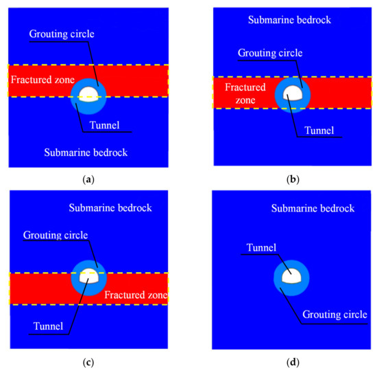Section diagrams of four representative working conditions at the intersection of submarine tunnels and faults: (a) Working condition 1; (b) Working condition 2; (c) Working condition 3; (d) Working condition 4.
