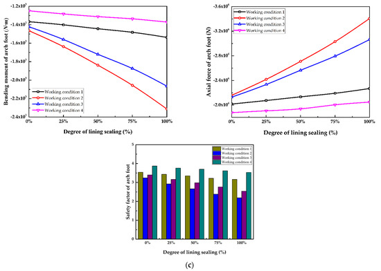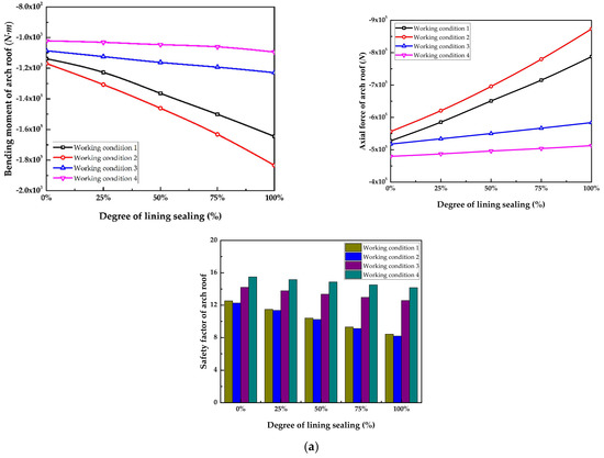 Internal force diagram and safety factor diagram of the lining structure with different sealing degrees under different working conditions: (a) bending moment, axial force and safety factor of the arch roof; (b) bending moment, axial force and safety factor of the arch waist; (c) bending moment, axial force and safety factor of the arch foot; (d) bending moment, axial force and safety factor of the inverted arch.