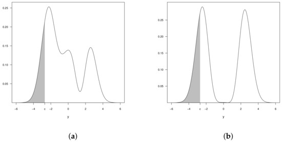 If , one can prove that the pdf (16) is a censored trimodal distribution, whereas, for , a censored bimodal distribution follows. For , a censored unimodal distribution is obtained. The Figure 1 shows some forms of the pdf of with censorship point and two values of .