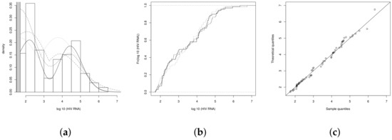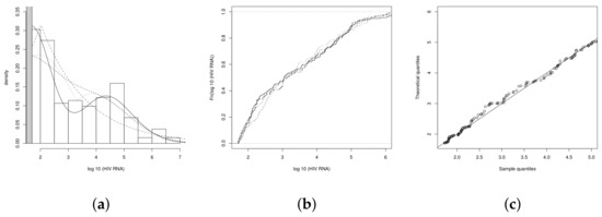 Summary statistics indicate that the data set has high positive skewness and low kurtosis compared to the normal model, which warns that the normal model with censored data may not be the best option for modeling the data set. In addition, Figure 3a shows strong evidence that the behavior of the variable HIV-1-RNA is bimodal.