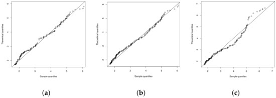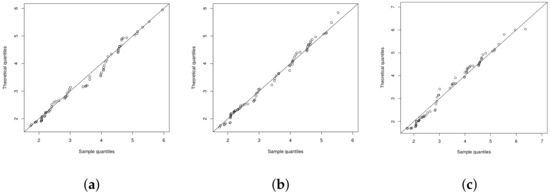 QQ-plot for models (a) CBSN, (b) CETN and (c) CFN.