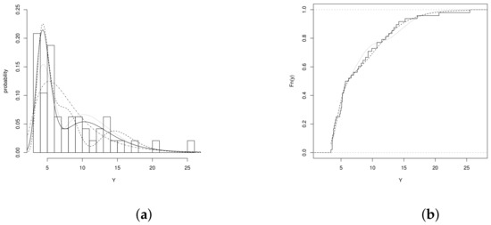 where denotes the likelihood function under model F. Replacing the values of the estimates in the above ratio, we obtain , which is higher than the percentile value of the chi-square distribution, given by, , leading to the rejection of the null hypothesis, which clearly indicates that the LBSAP model presents a better fit than LBSN model. The Figure 7a, shows that the LBSAP model presents the best fit compared to the rest of the fitted models while the graph of the Figure 7b shows the cdf of the LBSN and LBSAP models, note that these present a good fit.