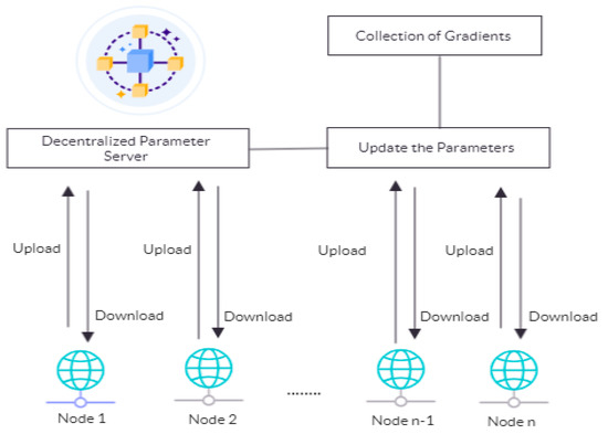 Our method relies on the parallelism technique, where multiple nodes contribute, through the SGD approach [15], to improving the accuracy of the model. The node stores its training model version while preserving the input of the model which forms a subset of all the datasets. As such, the nodes participating in the DL share similar model parameters by uploading and downloading parameters to and from the centralized server. The nodes are then needed to upload and update their training gradients via SGD. After upgrading a particular model, nodes will download the parameters from the server and repeat the training process, until the final trained model is obtained as shown in Figure 2.