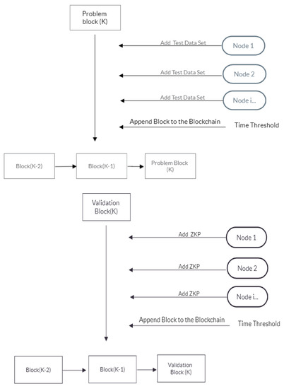 Each problem block contains data about the block number, problem definition, test datasets, and a hash of the parent block. Each validator block contains the block number, parent block’s hash, ZKP hash, and the block’s hash. The blockchain starts with a problem block specifying how the model is improved, followed by a validator block which verifies the accuracy of the model. When a given problem is submitted to the FL environment, it is broadcasted to the entire set of nodes in a particular cooperating group within a given time threshold. During this period, any node within the cooperating group can add test datasets to the problem. When the time threshold is exceeded, the problem block is committed to the blockchain together with the block number, problem specification, test datasets, and hash of the parent block. All the data are contained in the new block. This triggers competition time where model provers compete to submit their enhancements/accuracies to the blockchain via ZKPs. Each user who is designated as a validator confirms the DL model and submits a proof as a vote to the system. For each ZKP, an associated unique verification hash is computed and tracked in the blockchain. At the end of the competition time, validator blocks are committed to the blockchain which at this time contains the highest number of unique ZKPs. This triggers the next competition cycle, as shown in Figure 3.