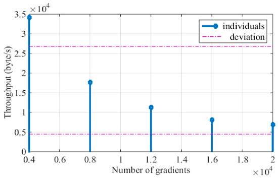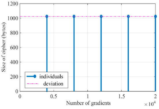 As evident in Figure 5, cipher size remains largely constant (ranging from 0 to about 1000 bytes), as the number of gradients increase. On the other hand, the system’s throughput progressively decreases, as the number of gradients increases, as shown in Figure 6.