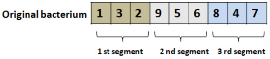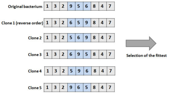 The bacterial mutation [23] operates throughout the population by performing special mutation operations on each individual (see Algorithm 2). As input parameters, the initial population, the number of clones (Nclones), and the length of the segment (Iseg) are passed. Steps 1–6 are performed on each element of the population. A certain number of clones (Nclones) are made from each bacterium; see Figure 1. The original bacterium is broken down into segments. As the algorithm shows, it happens with high probability for coherent segments, and with low probability for loose segments. During both the coherent and loose segment operations, we go through each segment. We select a non-mutated segment. First, the elements of the segment are inverted to form the first clone. Then, we randomly change the elements of the segment to create other clones. This way, we generate a total of Nclones clones. At the end of the mutation, the best clone takes the place of the original bacterium.