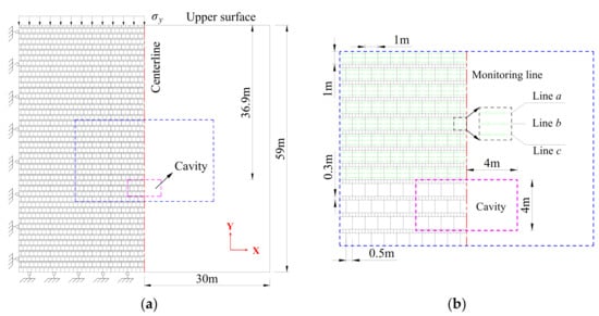 The mechanical response of layered jointed rock mass may have structural mechanical characteristics and computational efficiency problems caused by a high grid density. Hence, to conveniently analyze the stress and displacement distribution in the roof strata, a horizontal monitoring line was laid out at each part of the upper part (0.1 m from the upper surface, line a), the middle part (0.5 m from the upper surface, line b), and the lower part (0.1 m from the lower surface, line c) in each sandstone layer above the cave in a certain height range, as shown in Figure 1b.