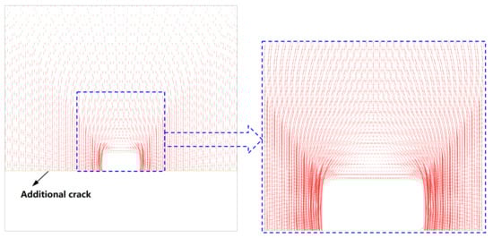 For comparison, a case of excavation in intact rock mass is also presented. Parameters used in UDEC simulations are the same as sandstone in Table 1. In UDEC, a crack must intersect the edge of the original block to create new blocks. Thus, one additional crack has to be created to retain the cavity in calculation procedure, as shown in Figure 2. It is observed that the stress within a certain zone in the vicinity of the excavation is disturbed. The rock mass stabilizes itself through forming an arch-shaped structure of the major principal stress above the opening. Beneath the arch-shaped structure is the distressed zone. Observed from the principal stress vector plot, the vertical stresses are almost zero and the horizontal stress is tensile stress within this zone.