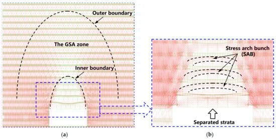 - After the excavation of a horizontally-layered jointed rock mass, the SAB was formed in the lower strata above the cavern, and the GSA was formed in the higher strata, both of which are symmetrical arch stress patterns. The GSA transfers part of the vertical load in the area near the central line of the cavern to the stable surrounding rock on both sides, and the SAB marks the formation of the self-stable structure of the low-level strata;