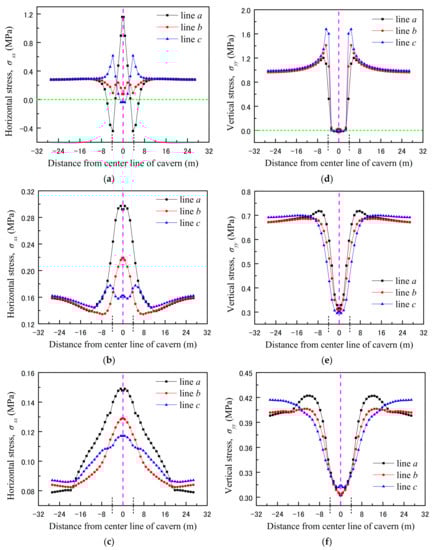 Distribution of horizontal stress and vertical stress in a sandstone layer of roof for case C1: (a–c) show the horizontal stress distribution (σxx) along the stratification direction (hb = 1.3 m, hb = 13 m, and hb = 23.4 m, respectively); (d–f) show the vertical stress distribution (σyy) along the stratification direction (hb = 1.3 m, hb = 13 m, and hb = 23.4 m, respectively).