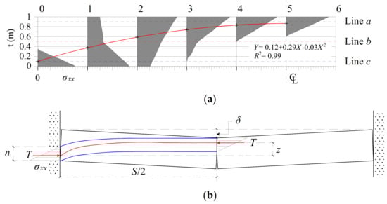 Mechanical structure and horizontal stress distribution of voussoir beam []: (a) Horizontal stress distribution (σxx) along voussoir beam (left abutment to center) with a span of 10 m (joint spacing Sj = 1 m) and (b) sketch of a voussoir beam with two blocks.