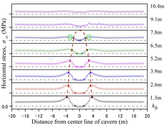 In case C1 simulation results, the bottom rock layer of the cavern roof has produced evident slip and settlement, which is regarded as a potential collapse layer beyond the scope of the SAB. Figure 4 shows the stress distribution in the sandstone layer at different heights above the cavern (e.g., the distance between the lower surface of the rock stratum and the excavation line of the roof hb = 1.3 m, 13 m, and 23.4 m). The diagram shows that: (1) The upper part of the low-level sandstone layer is in a high horizontal compressive stress state near the middle line of the cave, and a high horizontal tensile stress state is detected near the square of the cave wall. The distribution of horizontal stress along the stratification direction in the lower part of the rock layer is completely opposite to that in the upper part, and the horizontal stress value in the middle of the rock layer is low. (2) The vertical stress at different heights of the low-level sandstone layer shows roughly the same distribution law in the layered direction. The vertical stress value in a certain span near the central line of the cave is approximately 0, and the peak vertical compressive stress is slightly outside the cave wall. (3) With the increase of the distance from the excavation line of the roof, the stress directions at different heights of the sandstone layer at higher levels are consistent, and the stress value gap is reduced. Horizontal stress is relatively high above the cavern and adjacent areas, and the vertical stress is relatively low in this range.