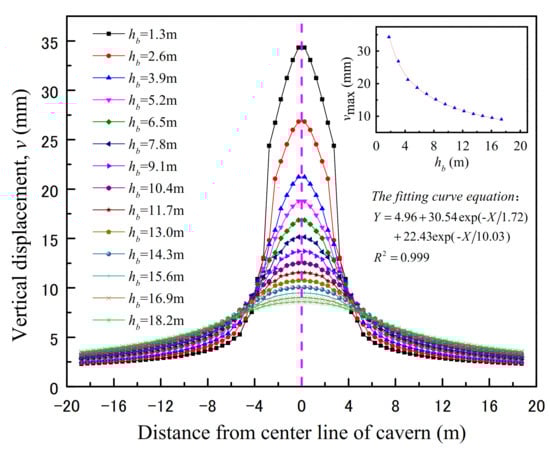 With the increase in distance away from the excavation boundaries, the influence of disturbance on the surrounding rock is gradually weakened, and the structural plane effect in the stress redistribution is alleviated. The high-level sandstone layers above the cavern are in a state of compressive stress, and no voussoir beam structures are formed. However, the disturbed high-level sandstone layers will bend and sink under the action of load, showing uneven displacement along the stratification direction. As shown in Figure 7, as the level of the sandstone layer increases, the maximum vertical displacement located on the central line of the cavern decreases exponentially. Nonetheless, the decline rate of the vertical displacement from the central line of the cavern to the boundaries of the model along the stratification direction slows down. Thus, the bending degree of high-level sandstone layer is small, and the length of bending section is large.