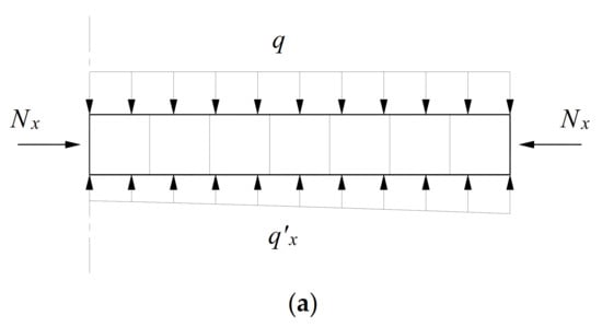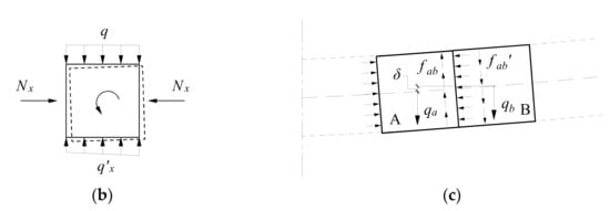 The rock strata above the cavern are loose due to the excavation of the cavern, and the displacement space of the rock strata near the central line of the cavern is large. According to the theory of foundation beam deformation and load, a certain sandstone layer in the roof is supported by the rock layers below it, which can be simplified as a non-uniform load form as shown in Figure 8. As q > q’x, the blocks in the rock layer rotate and sink. On the one hand, the rock blocks squeeze each other due to the change of spatial position, resulting in the increase of horizontal stress and decrease of vertical stress of rock layers. On the other hand, block A near the central line of the cavern tends to produce a larger settlement than block B near the model boundary. As a result, frictional resistance fab between the two blocks tends to keep rock block A in its original position. Consequently, the vertical stress of the block near the central line of the cavern decreases, and vertical stress of the block with smaller adjacent displacement increases. This phenomenon of stress transfer is the global stress arching effect of a horizontally-layered jointed rock mass, which is consistent with the stress distribution characteristics shown in Figure 4. The uneven displacement of the rock mass caused by cavern excavation is the reason for the formation of the GSA in the layered jointed rock mass, and the transfer of the vertical stress is an objective reflection of the existence of the GSA.
