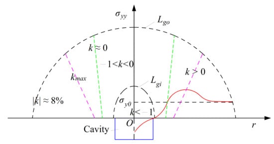 where σyy is the vertical stress in the lower part of sandstone layer after cavern excavation; and σy0 is the in situ vertical stress in the lower part of the sandstone layer before cavern excavation. For k < −1, it was the range of the tensile stress zone, and the lower compressive stress zone when −1 < k < 0 and the pressure stress concentration zone when k > 0.