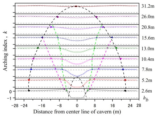 On the basis of the nature of vertical stress transfer during the formation of GSA, arch index k is defined to quantitatively describe the GSA zone in horizontally-layered jointed rock mass. Two partition curves are proposed to better describe the stress transfer characteristics. Outside the outer boundary of the GSA is the in-situ stress zone, and inside the inner boundary of the GSA is the tension stress zone and lower pressure zone of the vertical stress. In the GSA zone, the area near the central line of the cavern is in the low pressure zone due to part of the vertical stress being transferred, whereas the areas on both sides far from the central line of the cavern are in the pressure concentration zone due to receiving the load transferred from the middle area. As shown in Figure 9, the outer boundary of the GSA is the line connecting the points with small k value in each sandstone layer (8% in this study), and the inner boundary is the line connecting the points where the k value in each sandstone layer is close to −1 (σyy > 0). The two partition curves are the connections of points with k ≈ 0 and the kmax in each sandstone layer. The inner and outer boundaries of the GSA define the extent of principal stress deflection in roof strata. In the arching zone, part of the load in the area between the k ≈ 0 curves is transferred to both sides and below, the area under the k ≈ 0 curve receives the transferred load, and the vertical stress on the kmax curve is the largest. Arching index k is defined as: