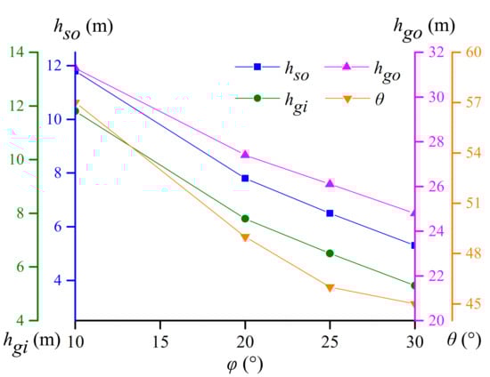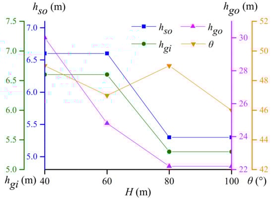 Overburden depth H has an important influence on the formation of stress arch. Figure 14 shows index values that characterize the stress arching zone under four overburden depth values (Case D1–D4) in the range of 40–60 m. As the overburden depth H increases by 20 m in the range of 40–100 m, the outer boundary height hgo of the GSA decreases by 13.9% on average. However, the outer boundary height hso of the SAB and the inner boundary height hgi of the GSA are not sensitive to the increase of an overburden depth of 20 m. When the overburden depth increases by 40 m, the two decrease by 19.7% on average with the same value. The extent of the stress arching zone decreases with the increase of the overburden depth, which is the same as the findings of He et al. []. Overburden depth H does not affect the stress transfer characteristics in the GSA zone. When its value changes, angle θ between the kmax curve and the horizontal direction fluctuates slightly at 48°.