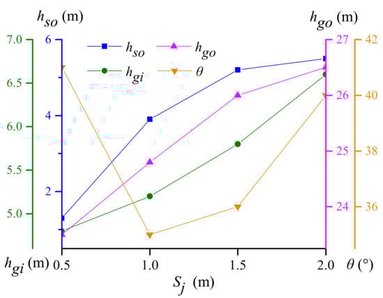 Fracture spacing in layered sedimentary rocks is roughly proportional to the thickness of the fractured layer, with the most common reported values of 0.3–1.2 []. To investigate the effect of sandstone joint spacing Sj on the stress arching zone, four cases (Case B1–B4) were designed and simulated. The Sj values ranged from 0.5 m to 2.0 m at intervals of 0.5 m. Figure 12 shows the height of the inner and outer boundaries of the stress arching zone and the horizontal angles of the kmax curve in the range of Sj from 0.5 m to 2.0 m. The results show that with the increase of sandstone joint spacing, the extent of SAB and GSA shows an increasing trend. When Sj increases in the range of 0.5–2.0 m, the outer boundary height hso of the SAB, the inner boundary height hgi of the GSA, and the outer boundary height hgo of the GSA increase by an average of 79.6%, 11%, and 3.4%, respectively. Sandstone joint spacing also affects the load transfer in the GSA, but the influence on the horizontal angle of kmax curve has no obvious regularity. The extent of the SAB zone increases significantly with the increase of joint spacing, that is, the larger the span/thickness ratio of blocks in fractured layer is, the easier the lower part of the fractured layer opens along the joint surface, which is consistent with the discovery of Diederichs and Kaiser [].