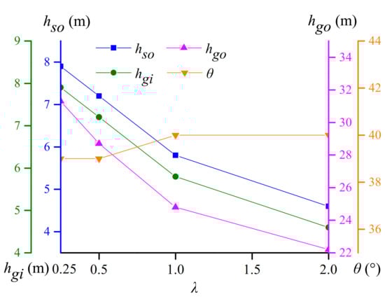 Four different values of the 0.25–2.0 lateral pressure coefficient λ (Case C1–C4) are considered to examine the effect of lateral pressure coefficient λ on the characterization index of the stress arching zone. Figure 13 shows the trend of the height of the inner and outer boundary of the stress arching zone and the horizontal angle of the kmax curve with the increase of the lateral pressure coefficient λ. With the increase of the lateral pressure coefficient in the range of 0.25–2.0, the outer boundary height hso of the SAB and the inner boundary height hgi of the GSA are reduced by 16.3% on average with the same value. In addition, the outer boundary height hgo of the GSA is reduced by 10.8% on average, and angle θ between kmax curve and horizontal direction is stable at approximately 40°. Under the same vertical load, the high horizontal stress within a certain range will inhibit the tensile opening of the lower part of the jointed rock stratum and reduce the looseness of the shallow rock mass. This effect causes the small range of load adjustment of the overlying rock, but it does not affect the transfer characteristics of vertical stress in the process of rock load adjustment.