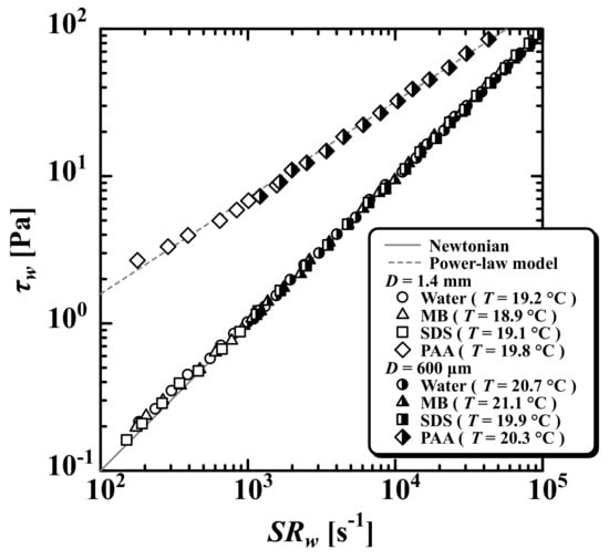 Figure 1 shows the relationship (log-log plot) between the wall shear stress and the wall shear rate of the test fluids measured by a capillary-type viscosity meter with an inner diameter of or 600 . The viscosity of MB and SDS agreed with that of water alone (), and the density for water () was used to summarize the experimental results. The experimental results did not vary for the density of the test fluids. We checked in pre-experiments. By contrast, the PAA exhibited non-Newtonian viscosity, and the power-law model