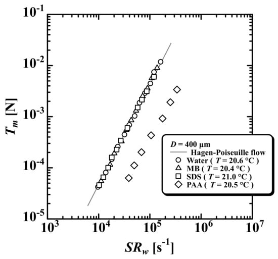 Next, the viscoelastic properties of the test fluids were measured as rheological properties by the jet thrust method [26,27,28]. Figure 2 shows the jet thrust plotted against the wall shear rate (log-log plot) measured using a capillary with an inner diameter of . The solid line is the prediction for Hagen–Poiseuille flow, i.e.,