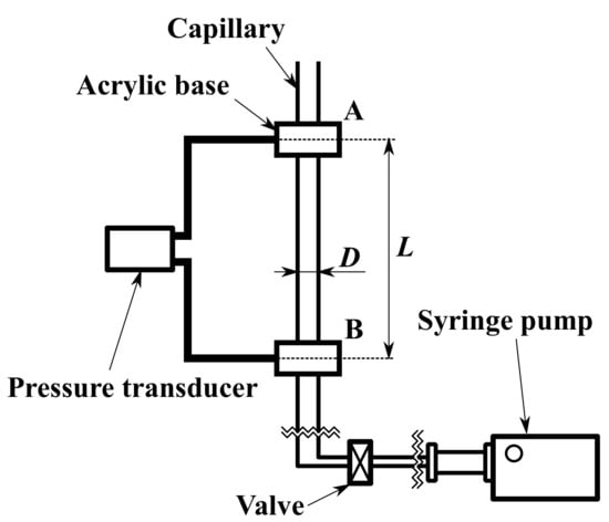 Figure 3 shows the experimental apparatus used to measure the pressure drop at constant flow rate. The test fluids were transported at constant flow rate Q using a syringe pump (JP-H1 and JP-H5; Furue Science Co., Ltd., Japan), and the differential pressure between sections A and B in Figure 3 was measured as the pressure drop using a pressure transducer (SDP-12; Tsukasa Sokken Co., Ltd., Japan).
