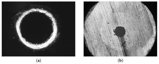 Three capillaries (SUS304) were used. The inner diameters were D = 750 (length L = 230 ), 490 (L = 120 ), and 110 (L = 80 ), where L is the distance between sections A and B in Figure 3. Figure 4 shows cross-sectional views of the capillaries with D = 750 (Figure 4a) and 110 (Figure 4b), taken with a commercial microscope (VH-8000; KEYENCE, Japan). The shape is complicated and not perfectly circular, and the inner diameter was measured by approximating a circle.