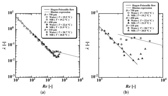Figure 5 shows the experimental results for water alone and MB, where the vertical axis corresponds to the frictional coefficient and the horizontal axis corresponds to either the Reynolds number or the generalized Reynolds number . For water alone and MB, was consistent with that of laminar flow () and with the Blasius expression