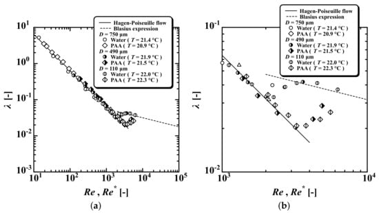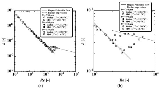 in the turbulent flow region () after the transition region (). The critical Reynolds numbers were () and (). The MB exhibited () and (). Figure 6 and Figure 7 show the experimental results for SDS and PAA, respectively, which also showed pseudo-laminarization with (), remaining in the laminar state up to between approximately and . For SDS, the critical Reynolds numbers were () and (). For PAA, the critical Reynolds numbers were () and (). For , laminar flow persisted up to the limit of the syringe pump for all test fluids. Moreover, it was confirmed that pseudo-laminarization occurred regardless of whether the inner diameter or 490 was used in the experiment.