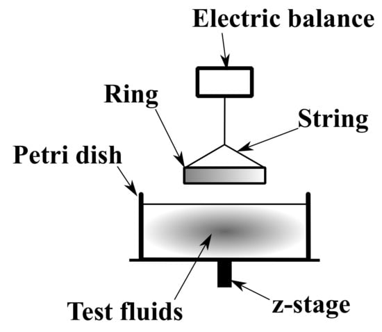 In Section 5.2, we discussed the possibility that the interfacial tension between the wall and the test fluids decreased because of electric interaction. This was verified by measuring the surface tension using the du Noüy method [42], and Figure 8 shows an overview of the experimental apparatus. A circular ring connected to an electronic balance (GR-200; A&D Co., Ltd., Japan) was lowered via a string, and the ring was gradually pulled away from being in contact with the test fluid. A Petri dish filled with the test fluid was placed on the z-axis stage, which was then raised to bring the ring into contact with the surface. At this time, the scale value of the z-axis was read. As the stage was lowered gradually, the liquid attached to the lower end of the ring was gradually stretched and eventually broke, whereupon the maximum value of the electronic balance and the scale value of the z-axis were recorded. If we consider the balance of forces, the force acting on the liquid in contact with the ring and being pulled up is equal to the force due to its own weight (gravity) and the surface tension , giving
