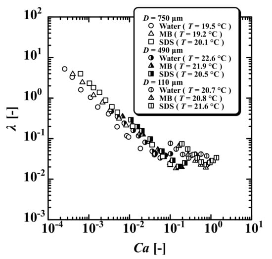 which is defined as the ratio between the force based on viscosity and that based surface tension. Figure 9 shows the critical capillary number at which the transition began. For D = 490 , is (water), (MB), and (SDS). For D = 110 , is (water), (MB), and (SDS). It was found that and the flow field was strongly influenced by the interface.