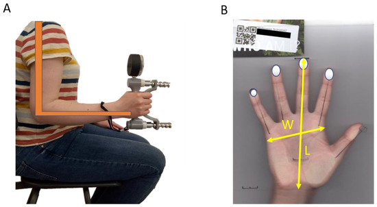 Appropriate posture and arm/hand position for the grip strength on the poster showed to participant (A) and the measurements taken on hand scans (B). W = hand width, L = hand length.