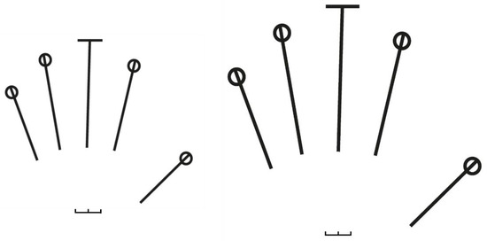 We measured hand size and shape from scans using a flatbed scanner (Epson Perfection V39). Participants were asked to place each hand palm side down, lining up their fingers to fit within an outline drawn on a transparent plastic sheet and keeping the fingers and palm flat (Figure 1B). Two differently sized outline transparencies for intermediate and large hands were available to allow a participant to best align their hand in a standardised manner (Figure 2). A 2 cm scale was included in each transparent plastic sheet to facilitate the accurate measurement of hand size from the scans. Hand size and shape were measured from each scan using freeware tpsDig2 software version 2.31 [83]. The hand width (W) was measured from the radial side of the second metacarpal joint to the ulnar side of the fifth metacarpal joint and hand length (L) from midline of the distal wrist crease to the tip of the middle finger (Figure 1B), following [59]. A ratio of hand width to length (W/L) was used as an indicator of hand shape, such as in [59]. We denoted hands with a ratio >0.5 as ‘wide’ hands and hands with a ratio <0.5 as ‘long’ hands. To correct the potential effect of hand size on grip strength, W*L was used as an estimate of hand area to quantify the relative grip strength (i.e., grip strength/hand area). All measurements were taken by one researcher (KT) and to test interobserver error, 20% of both right and left hands (n = 266) were measured by a second researcher (AB). An intraclass correlation coefficient (ICC) was used to test for interobserver reliability in R (R Core Team, 2020) with the “irr” package [84]. Both measurements of right and left hands were consistent between the two observers (ICC = 0.981, p < 0.0001), indicating an excellent reproducibility and repeatability of the measurements. Therefore, we only used the measurements of the first researcher for all subsequent analyses.