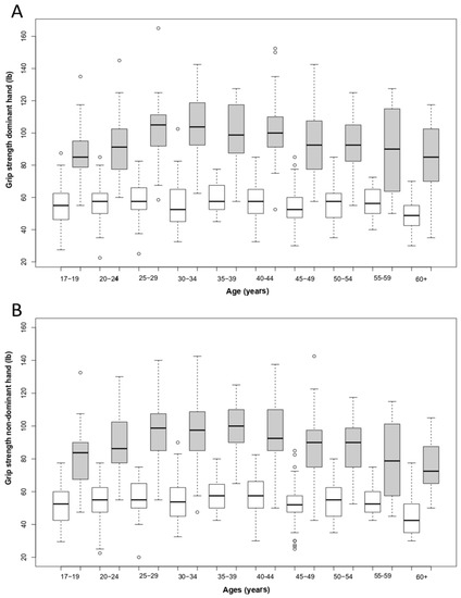 Grip strength (lbs) performance in males (grey) and females (white) for the dominant hand (A) and the non-dominant hand (B). The boxplots show medians (solid line) and interquartile ranges of grip strength according to age groups. The dotted lines indicate variability outside the upper and lower quartiles, except for “outliers” (dots).