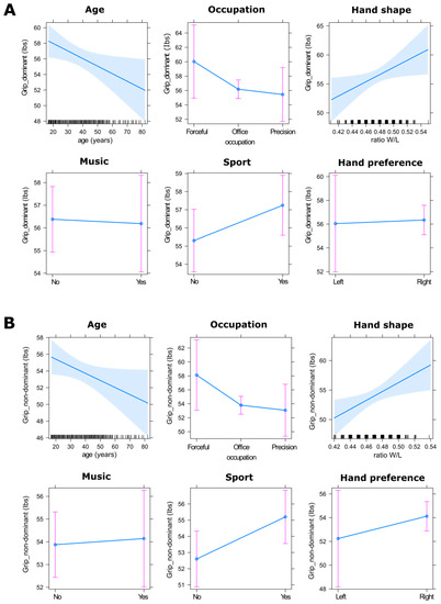 Next, we fitted four linear multiple regressions to predict the four outcome measures of: (1) male dominant hand, (2) male non-dominant hand, (3) female dominant hand, (4) female non-dominant hand. Our predictor variables were age, occupation, hand shape, hand preference, playing music, and playing sport. These six predictor variables were considered as fixed effects and grip strength was considered a random effect. The function “predictorEffects” from the package “effect” [85] was used to graphically represent the model effects. An ANOVA was performed for each model to statistically test the effect of the predictor variables on grip strength. Tukey corrections were used for post-hoc analyses. All tests were performed with R 3.6.3 [86] with level of significance set at p ≤ 0.05.