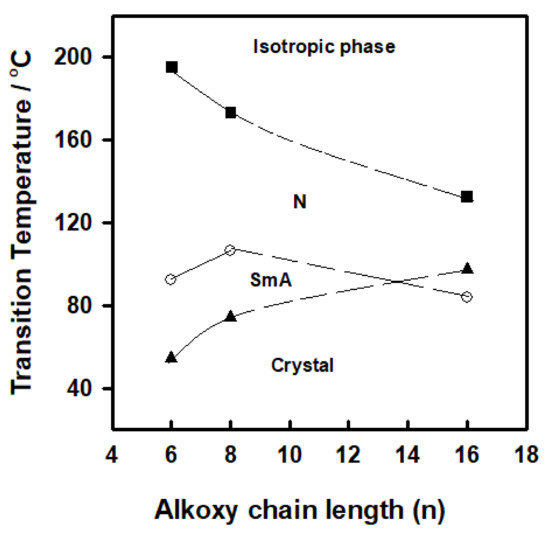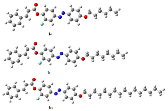 Generally, the molecular shape, polarizability, and dipole moment of the investigated system are highly affected by the electronic nature of the attached terminal groups. Additionally, the mesomorphic properties are influenced by an increment in the polarity and/or polarizability of the mesogenic portions. In the present study, the mesophase range and stability of the investigated series increased in this order: I6 > I8 > I16. The mesophase behavior of rod-like molecules was a direct result of molecular–molecular interactions that are mainly dependent on the molecular geometry of the terminal polar groups. The increment in the Van der Waals attraction forces between the terminal alkoxy chains facilitated their lamellar packing and the observation of the smectic A phase in addition to the N phase. Furthermore, the mesomorphic thermal stability reflected the nonsymmetric electronic properties of the different terminals of the molecule.