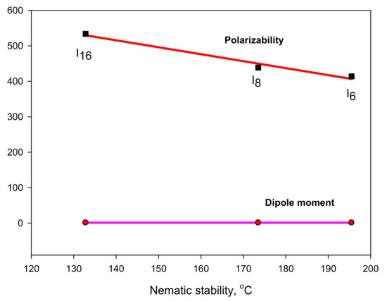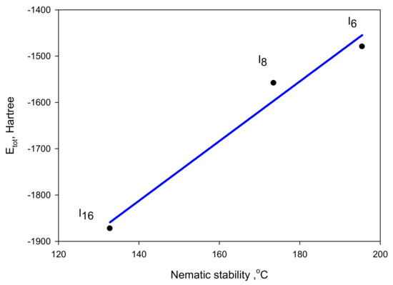 Total thermal energy, dipole moments, and polarizability of the optimized conformers were related with the experimental finding values of the mesophase thermal stability and the length of terminal alkoxy chains (n) in order to evaluate the effect of n on the predicted thermal parameters. Figure 5 illustrates the correlation between the N stability and the total thermal energy (Etot) of the molecule bearing changeable terminal chain length. Table 2 and Figure 5 show a pronounced decrement in Etot with increasing n, and an increment as the N stability increases. Figure 6 shows the relation between the N stability and the whole polarizability and dipole moment of molecular structures (In). The relation indicated that the mean polarizability has a pronounced decrease with increment in N stability and increases as the chain length increases. This could be ascribed to the increase in the aspect ratios, which influence the space filling of the LC materials and lead to the enhancement of the mean polarizability as the terminal chain length increases. Additionally, the dipole moment has nearly constant relation with the nematic range independent from the alkoxy chain length, as shown in Figure 6. The van der Waals week intermolecular attractions have a role in destabilizing the observed N mesophase as the length of alkoxy chain is increased. The lower dipole moments values allow the terminal aggregations to predominate, which enhances the N mesophase formation.