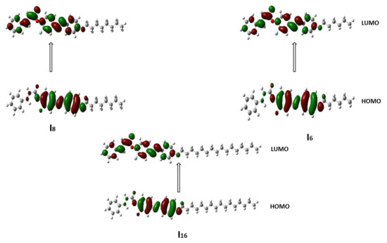 The investigations of frontier molecular orbital HOMO (highest occupied) and LUMO (lowest unoccupied) distributions for the present synthesized compounds, In, are represented in Figure 7. Table 2 collects their resulting energies and energy gaps. The energy gap (∆E) between HOMO and LUMO levels is a function of the chemical reactivity of compounds. The lower its value of energy gap (∆E), the more reactive the molecule is. The predicted energy gaps (Table 2) confirm that all members of the investigated series In possess the same reactivity. In addition, they have the same softness because the energy gap is inversely correlated to the softness (softness = 1/∆E). Furthermore, all the designed homologues (In) showed similar electron cloud distributions over the carbon atoms and π-system of the azo linkage and lateral F atom.