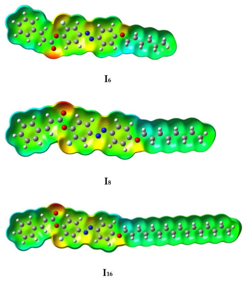 The molecular shape of the designed LC compounds is affected by the mesomeric configurations, which are normally impacted by the molecular-molecular interactions. The electronic structure, molecular polarizability, dipole moment, and many other parameters are influenced by the electron density distribution at atomic sites of LC materials [27]. Prediction of the presence of inter- or intra-molecular interactions of the designed molecules via the molecular electrostatic potential (MEP) is one of the best tools. MEP is an indicator which shows the distribution of electron density within the molecular structure. The charge distribution map for the investigated materials In, was computationally predicted under the same B3LYP/6-311G** level of calculation according to MEP (Figure 8). The MEP examinations suggests high electrostatic potential but low electron density for the terminal polar alkoxy groups of all the prepared members (In); this is represented by the blue cloud. On the other hand, the red regions (which indicates high electron density) are expected to be localized on the mesogenic cores, which appear at the oxygen atoms of the ester linkage and the alkoxy chains.