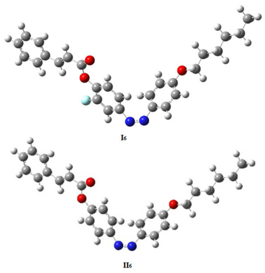 In order to investigate the isomerization effect on the mesomorphic properties of laterally F (In) and laterally neat (IIn) derivatives, the total energies of homologues I6 and II6 were predicted by the same set B3LYP level using 6–311G** basis set. All estimated data were collected in Table S2. The optimized z-form structural geometries of both compounds (I6 and II6) showed non-planar conformations (Figure 9). Moreover, their thermal energies were higher values than the E-isomers. Thus, the E-isomers proved to be stable and planar geometries, which satisfied the mesomorphic properties requirements.