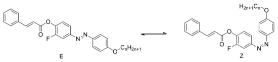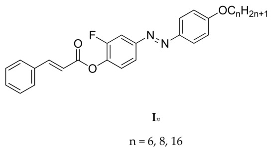 Continuing our work concerning the design and investigation of azo LC materials, a non-symmetrical homologues series based on a latterally attached F atom, namely 2-fluoro-4-(4-(octyloxy)phenyl)diazenyl)phenyl cinnamate (In) (Scheme 1), was synthesized and evaluated experimentally and theoritically.