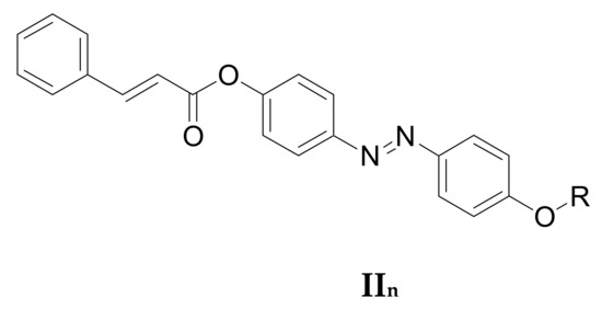 Recently, liquid crystal (LC) materials have exhibited excellent applications in non-linear optics [1], photonic devices [2], liquid crystal displays [3,4], and photo-switching materials [5]. The steric packing of rod-like geometry plays an important role in the phase transition phenomena of LC materials [6,7]. Symmetric and non-symmetric families of different linkages have been widely employed in the preparation of numerous LC materials [8,9,10,11,12]. For instance, azobenzene systems have good advantages over derivatives with other linkages. The azo linkers are thermally stable and attractive for investigating photo-induced approaches [13]. Moreover, they can generate photoactive LC materials because they can easily undergo trans/cis photo-induced isomerization. Thus, azobenzenes are also widely reported [13,14,15,16,17,18,19,20,21,22,23,24,25,26].