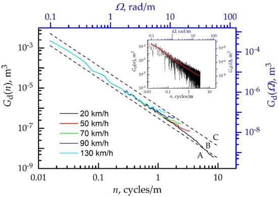Smoothed PSD spectra of pr222 profile passed at various speeds. Inset show original (dotted line) and smoothed (red line) PSD at 50 km/h. Dashed lines show the boundary between road class A, B, and C [].