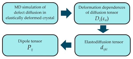 Thus, for a full determination of dijkl in the cubic crystal system crystals, it is sufficient to consider only three specific strain states, for example, V1, V2, V4. Knowing dijkl, we could determine the dipole tensor of the effective RD saddle-point configuration [], allowing us to simulate the diffusion of defects in elastic fields of any arbitrary type, including inhomogeneous ones (e.g., dislocation fields).