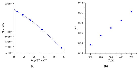 Figure 2 shows the MD-calculated dependences D(T) and f tr(T) for di-interstitials in Cu in the absence of external elastic fields (here and hereafter, the data inaccuracy in the figures is not indicated, since it was smaller than the size of the symbols presented on the graphs). The dependence D(T) was non-linear in Arrhenius coordinates (Figure 2a): the parameters of Arrhenius approximations at low and high temperatures differed (Table 2). Despite the low activation energy, which is usually inherent in one-dimensional diffusion of self-point defects in metals, di-interstitial diffusion is essentially three-dimensional: ftr values are markedly different from zero and increase with temperature (Figure 2b) from 0.17 at 300 K to 0.36 at 700 K.