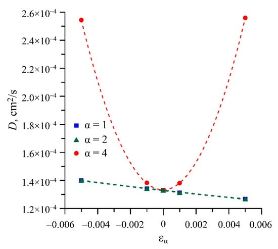 The eigenvalues of the elastodiffusion tensor d(α) can be obtained by adjusting their values in such a way that expression (4) would describe the calculated dependences in the region of the small εα, in which the linear nature of such dependences is observed. For the specified region, the expressions following from (4) are valid: