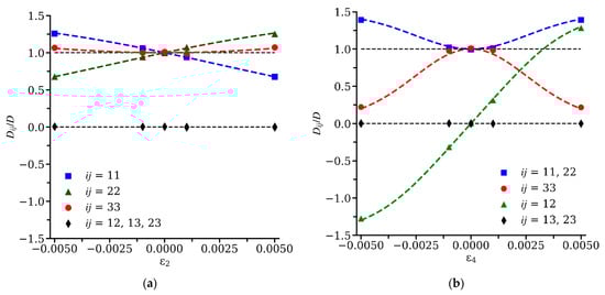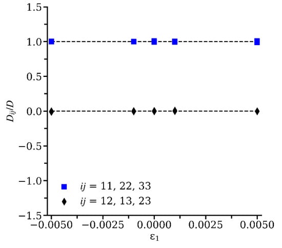 For εij = 0, within the calculation inaccuracy for the considered T. Strain state V1 does not change the symmetry of the crystal, so must also be true. Strain states V2 and V4 lower the symmetry of the crystal, which should lead to a change in , imposing certain relations for its components (Table 3). For the MD-calculated dependences , these relations are actually fulfilled within the framework of the calculation inaccuracy (Figure 4 and Figure 5).