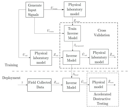 Response Reconstruction overview. In the initial phase of response reconstruction, a set of input signals are designed in such a manner that they excite the desired dynamics of the system. The choice of the excitation signal is given in Section 2.2. The laboratory test rig is then excited by the inputs to obtain the corresponding outputs . With these known inputs and outputs, an inverse model of the system can be mapped. Direct inverse system identification is used to obtain the model parameters . We cannot directly use the model parameters without regularisation. Cross validation is employed to determine the amount of regularisation required. The input U is not unique for a given output Z; therefore, we cannot easily compare the reconstructed input against the known input . Instead, we pass the reconstructed input through the physical model to obtain the reconstructed output which allows for direct comparison against the known output . The discrepancy between and is what we are trying to minimise in the cross validation step. This means that the cross validation step requires a physical forward pass through the physical laboratory model. The field collected data of the system (for which we do not know the true inputs ) can then be inverted to approximate the real world input given the final set of model parameters . The approximated input can now be used to recreate an approximation to the real world response by using the inputs to excite the laboratory test rig. This final input can then be repeated indefinitely for ADT. An important distinction to make here is that we are not particularly interested in the inputs themselves even though we are employing inverse methods. We are instead interested in the quality of the reconstructed responses.