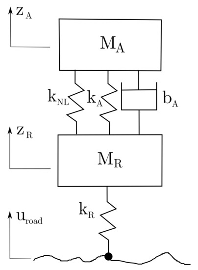 A simple two-degree-of-freedom nonlinear mass–spring–damper system, representing a quarter car model is used to investigate the methods explored in this paper. The numerical model employed is shown schematically in Figure 3. The sprung mass and unsprung mass represent the mass of the vehicle’s body and the suspension–tyre system, respectively. These bodies are connected by springs and dampers, which represent the dynamics of the suspension system. The unsprung mass is then connected to the road via a spring characterising the tyre stiffness. The system is excited by a road profile .