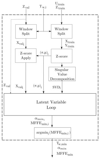 A graphical overview of the training process is shown in Figure 5 with focus on the window parameter search. The window optimisation loops over the window length, , where i represents the ith iteration of the loop. The training set and as well as validation output are then windowed accordingly. The z-score parameters, and , are then calculated using only the training dataset and applied to both the training and validation set. The training set is then decomposed using SVD according to the regression method specified, in this case RR. The decomposed SVD is then passed to the regularisation optimisation loop.